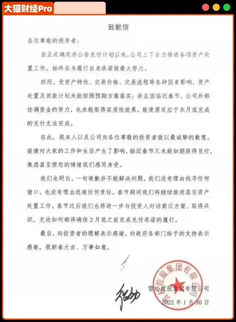 张老板发了致歉信,官宣了理财产品暴雷,并称春节后会与投资者商量兑付方案,他说他不会跑,“2022年我已经准备好了被限高、被追债”。