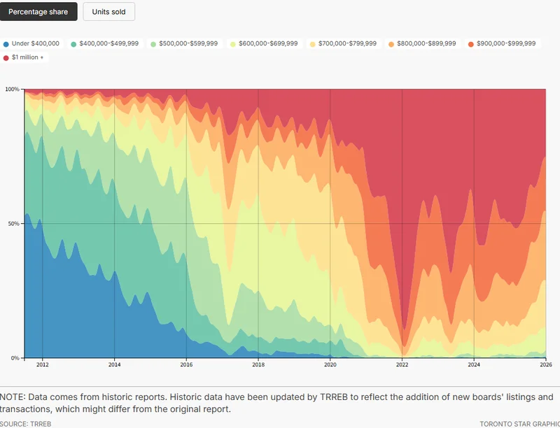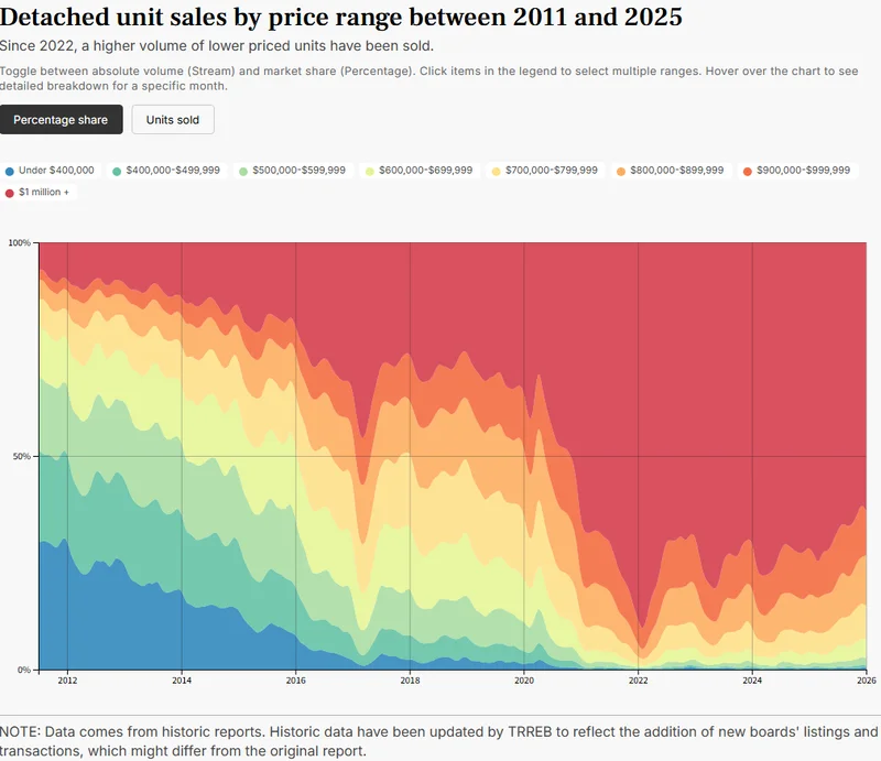 TRREB 数据显示,2022年2月,仅有4.5%的独立屋售价在90万至99.9999万加元之间,1.8%在80万至89.9999万加元之间。而今年1月,这两个比例分别飙升至10.4%和11.8%。