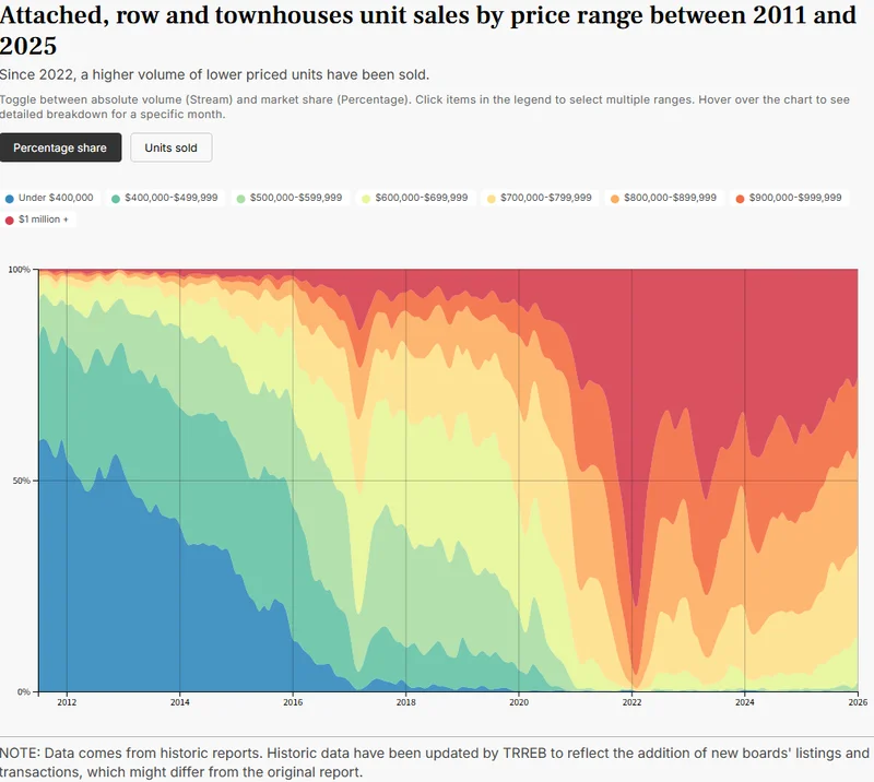 据多伦多地区房地产委员会(TRREB)数据,疫情高峰期,仅有2.5%的公寓售价在40万至49.9999万加元之间。而今年1月,这一比例飙升至26.9%以上。