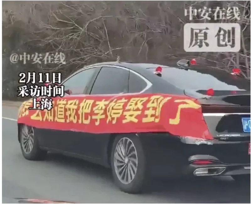 董先生从上海返乡过年,途中偶然遇见了这辆婚车,车上挂着醒目的横幅,上面写着“你怎么知道我把李婷娶到了”,这句幽默而温馨的话语立刻让人会心一笑。由于路途遥远,这辆婚车显得格外孤单,只有新郎自驾载着新娘,然而这并没有影响他们的好心情。