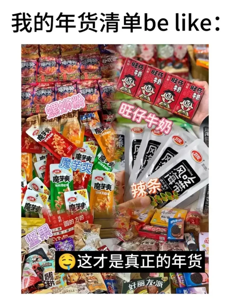 但00后的年货,让这种消沉的过年氛围彻底支棱起来了。“毕竟当你手里拿着的不是大集上买的花生瓜子,而是魔芋爽、卤味鸡爪和蜜雪冰城时,再挑剔的年轻人也会被吊成翘嘴,在这种碳水和糖精的轮番轰炸下,悄然卸下所有的防备。”