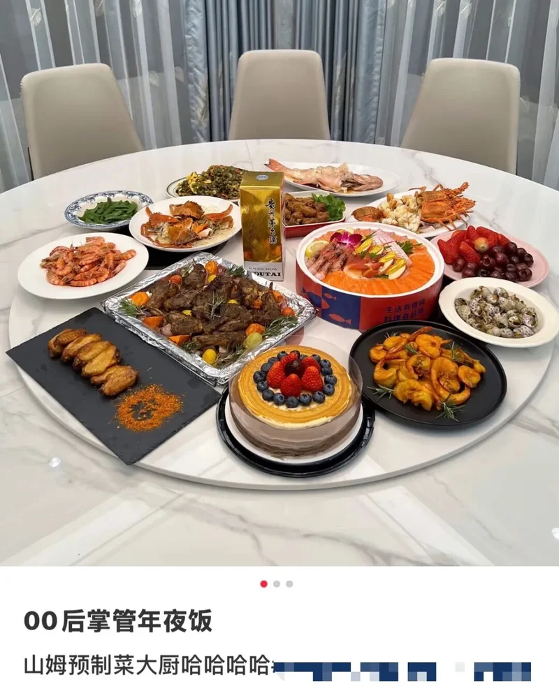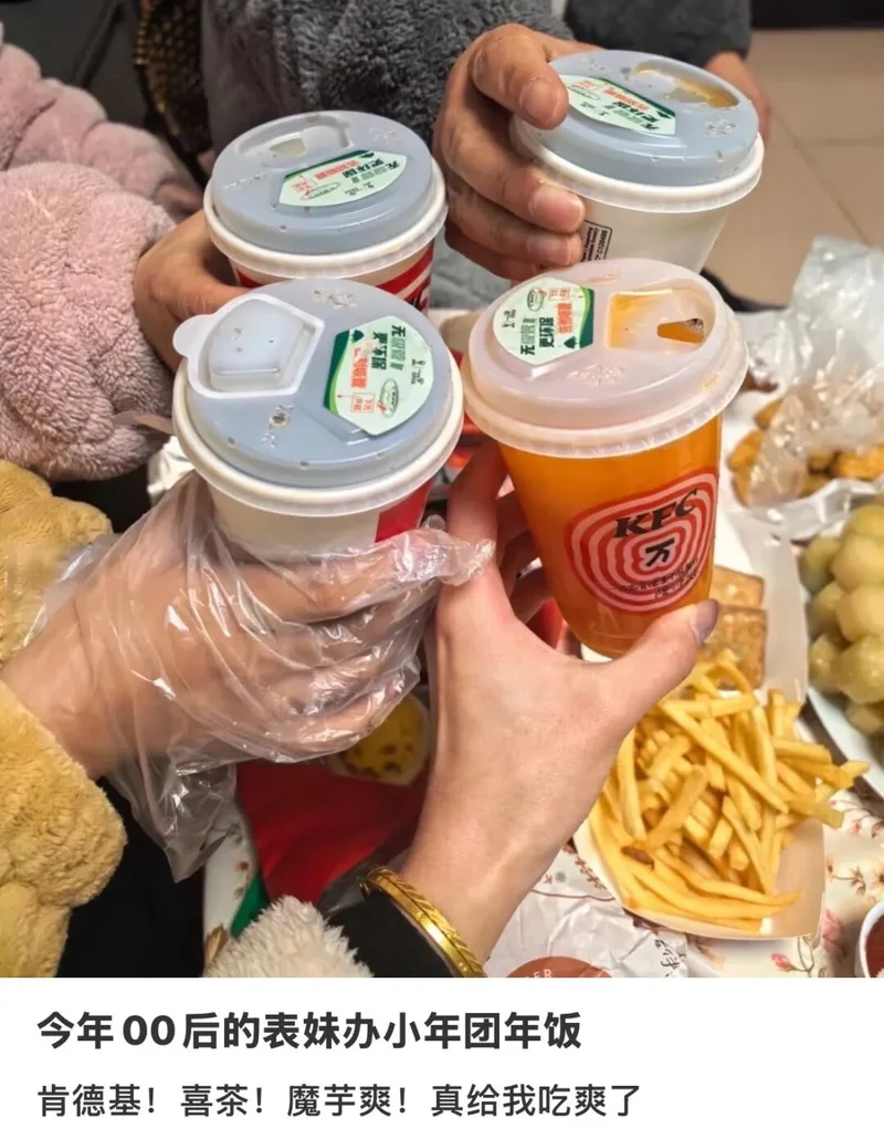 “00后的过年国宴,是盒马买来的预制菜,无论你想吃松鼠桂鱼还是狮子头,都是一个微波炉能搞定的事儿;提前点好的肯德基全家桶,全家人当下酒菜吃;最重要的是一人得点一杯蜜雪冰城,家里人提一杯时都得就着珍珠和芋圆了。”