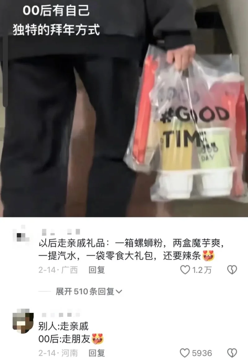 甚至在走亲访友这方面,00后也有自己的想法。“虽然平时去看望老人,都得拎着鸡蛋、牛奶和米面油,但是00后之间过年送礼的硬通货,却是螺蛳粉、AD钙奶和卤鸡爪。要是来拜年的人能拎着这些硬货上门,说明这个人真能处。”