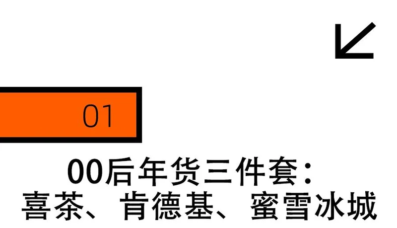 而这届年轻人买年货的首要宗旨,是自己吃得爽。顶级00后的“年货三件套”,已经变成了喜茶、肯德基和蜜雪冰城。