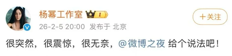 还有人猜测就是杨幂方找人换了姓名条的位置,不过,在事件发酵后,杨幂工作室倒是火速回应道:“很突然,很震惊,很无奈”,还艾特微博之夜官方给个说法。