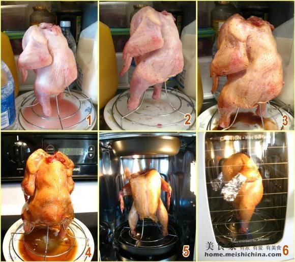 一、将鸡只解冻,放在冰箱里,用烤炉支撑鸡只的架支撑住鸡,让水慢慢地干;