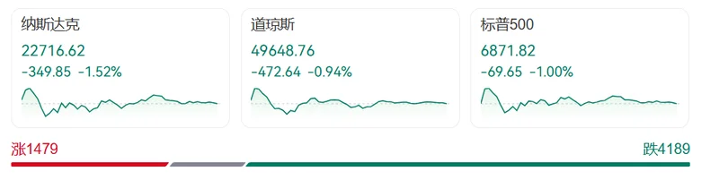 美股三大指数突然集体跳水,截至发稿纳指跌超1.5%,道指跌近1%,标普500指数跌1%。