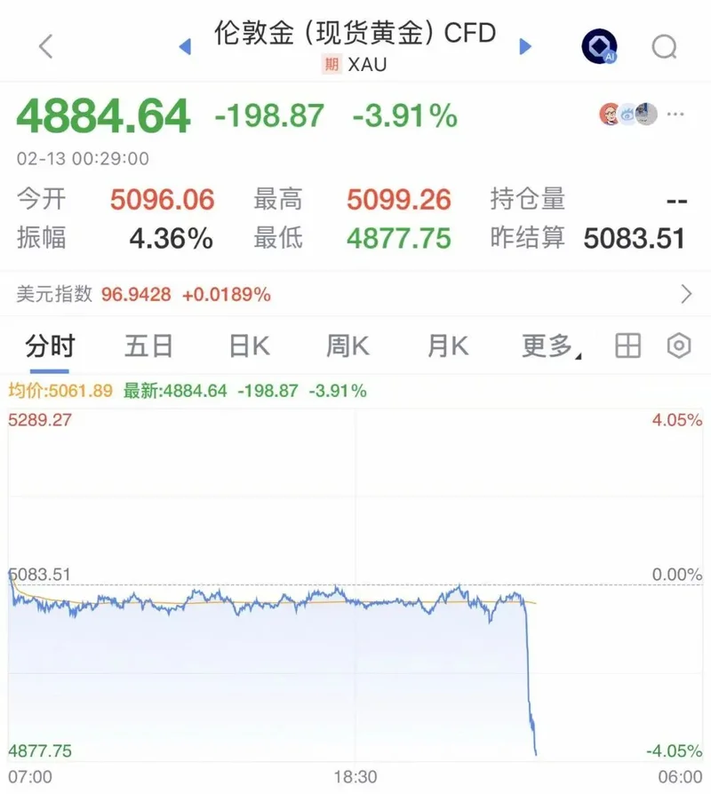 北京时间2月13日凌晨,金价突然闪崩,截至发稿,现货黄金价格直线跳水超3%,日内跌近200美元。现货白银价格跌超8%。
