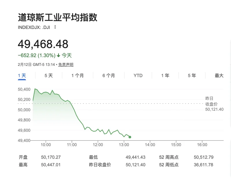 科技股又跳水了!2月12日晚间,美股三大指数震荡跳水,道指微跌,纳斯达克指数跳水跌超1%,标普500指数跌幅扩大至0.5%。