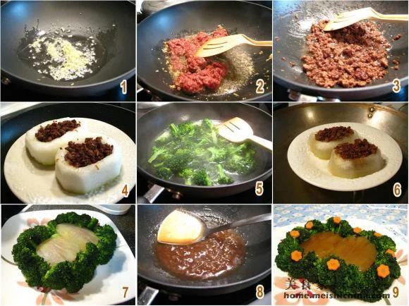 四、然后将炒过的肉碎装入冬瓜的洞内,稍压平一下,洞口向上,放在大锅内蒸30-45分钟(看你的熊掌有多大啦,如果是较大的,蒸的时间要相对长,反正以蒸至冬瓜熟到较熟明为止)。如果锅盖呈半球形,里面的蒸汽不会倒流在碟面,如果盖是平面的,表面可加层不怕高温的薄膜或倒扣个盘子。五、在蒸冬瓜的同时可将西兰花焯水至熟,水中放几滴油和少许盐,这样可以给西兰花点底味和增加西兰花表面的亮度。焯熟后盛起;