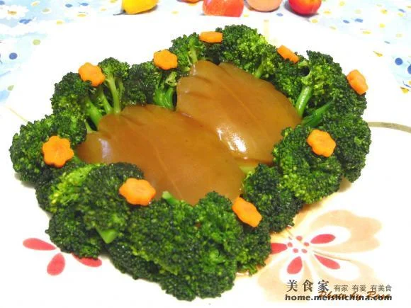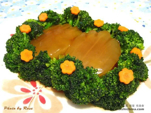 七、然后倒扣在另一碟子上,肉向下。然后用焯熟的西兰花围住熊掌;