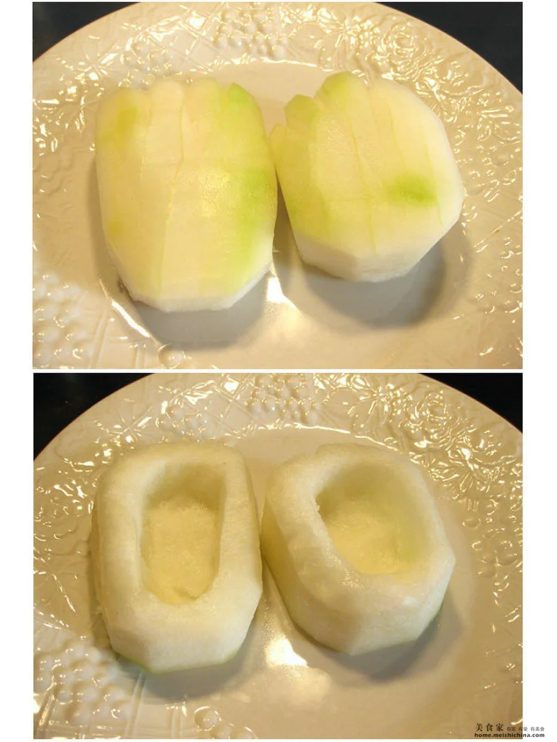 一、将冬瓜块去瓤,切成熊掌形状,在瓤的那边挖个椭圆形孔装肉碎;