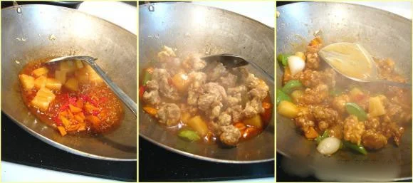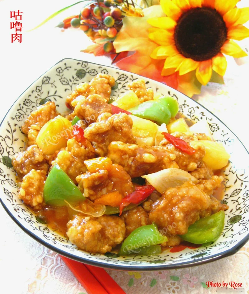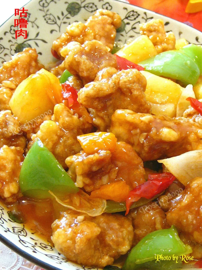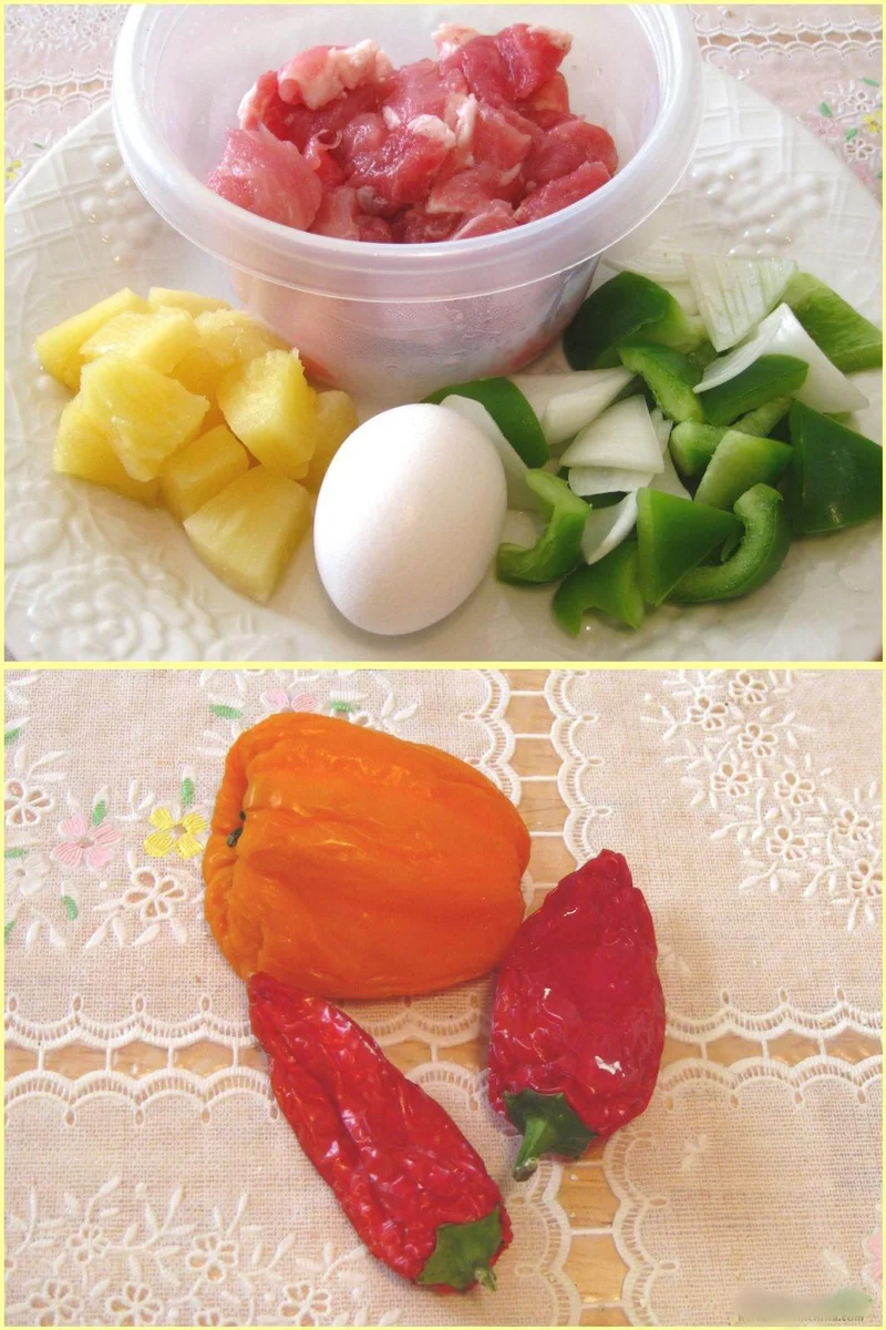猪肉、菠萝、洋葱、菜椒、番茄酱、糖、醋、急汁、盐。