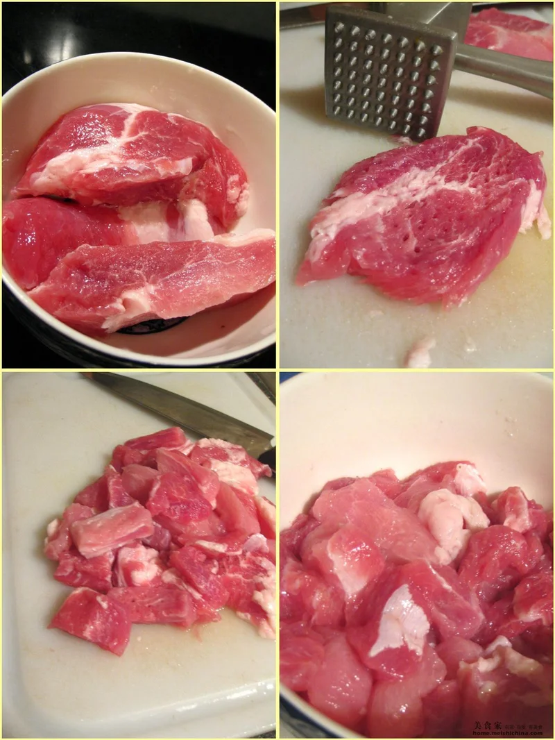 一、猪肉切成长条,用刀背拍松,再切成2厘米的块;