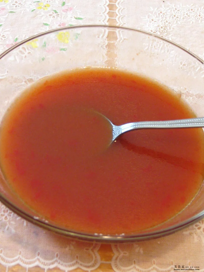 三、兑汁:白醋、糖、番茄酱、急汁、盐、生粉,调匀,一般来说,酸甜汁勾兑比例为1:1,还有茄汁的因素,可矢量多加点糖;
