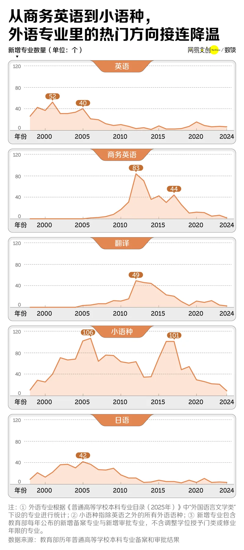 1998-2009 年,全国新增了 346 个英语专业,日语几乎并驾齐驱,新增 323 个。彼时受益于日企在华扩张,叠加赴日留学升温,高校顺势一拥而上,日语成了英语之外最火热的小语种 [6]。