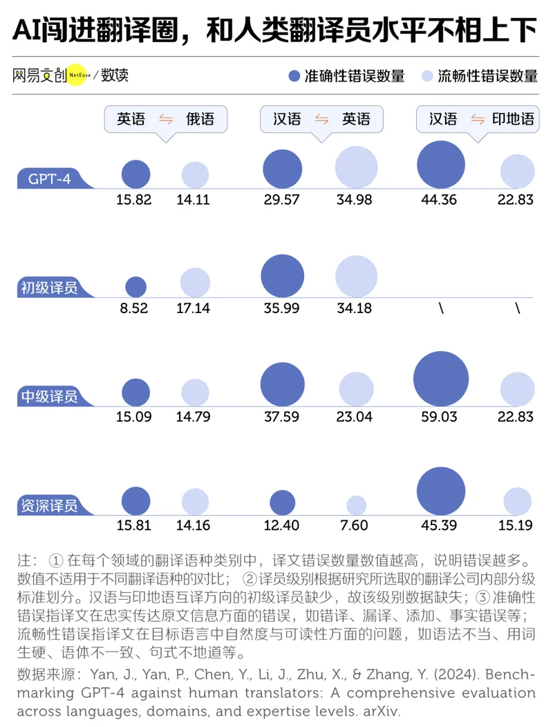 在一项针对 GPT-4 的实测研究中,研究人员把不同水平的人类译员拉上擂台,选取了三组语种比较翻译表现,涵盖数据储备丰厚的英语、资源中等但结构复杂的俄语和汉语,以及相对稀缺的印地语 [8]。