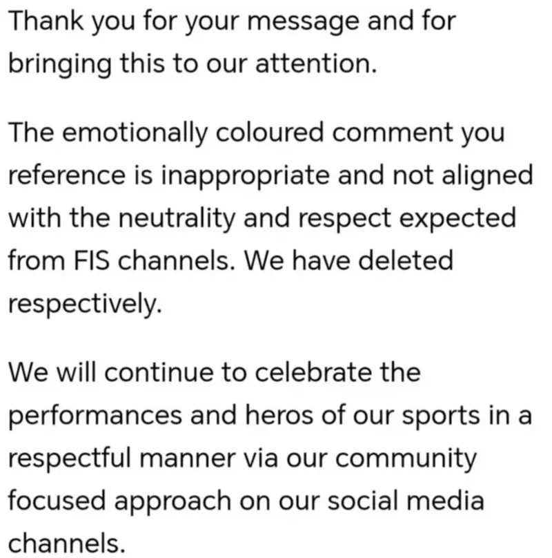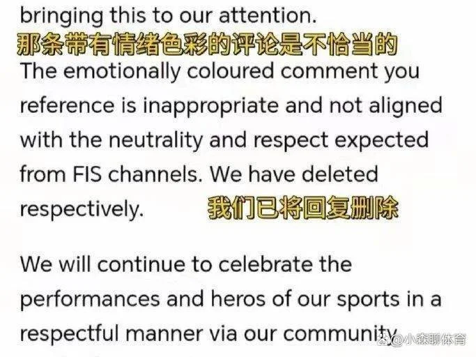 遭到投诉之后,国际雪联官方在邮件中道歉,“感谢您的留言,并提醒我们注意这件事。您引用的情感色彩评论是不恰当的,不符合国际雪联所期望的中立性和尊重。我们分别删除了。我们将继续通过社交媒体以尊重的方式庆祝我们体育的表演和英雄。再次感谢您的关心,祝您度过美好的一天。”