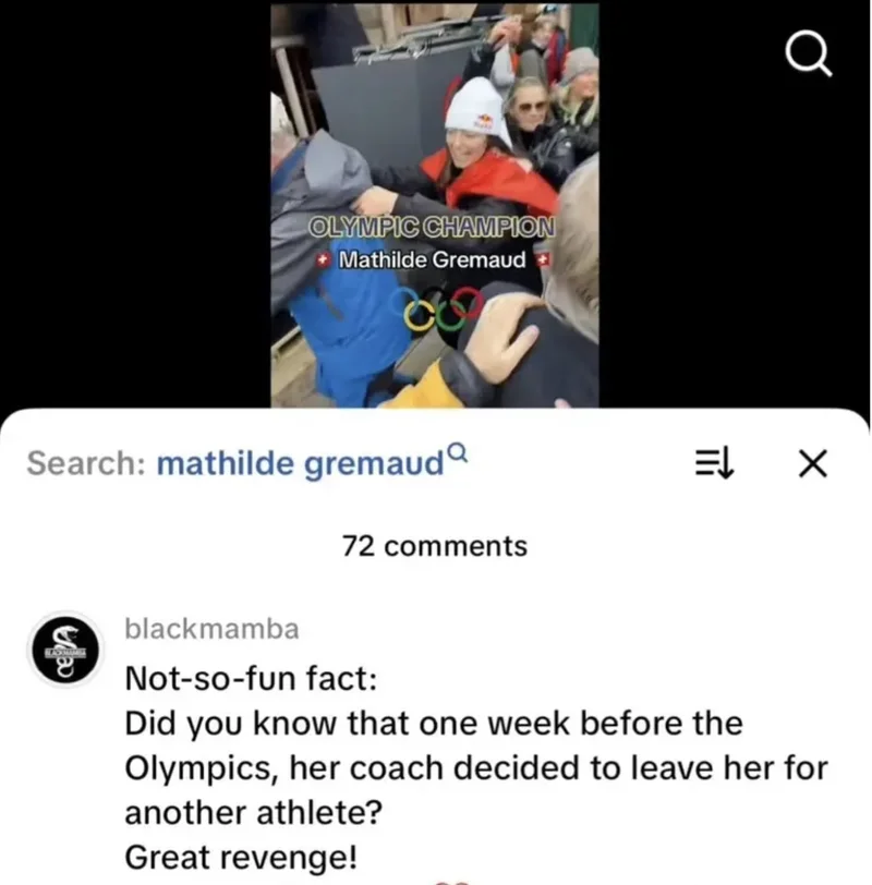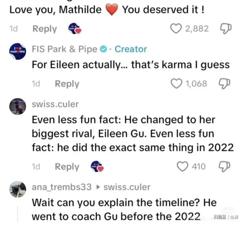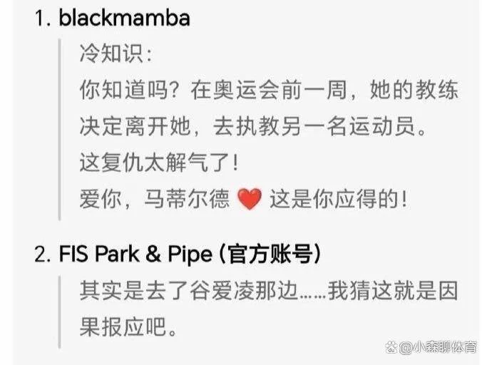 然而,网友“黑曼巴”在国际雪联官方账号的评论区留言:“冷知识:你知道吗?在奥运会前一周,她的教练决定离开她,去执教另一名运动员。这复仇太解气了!爱你,马蒂尔德,这是你应得的!”