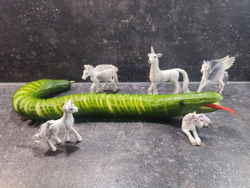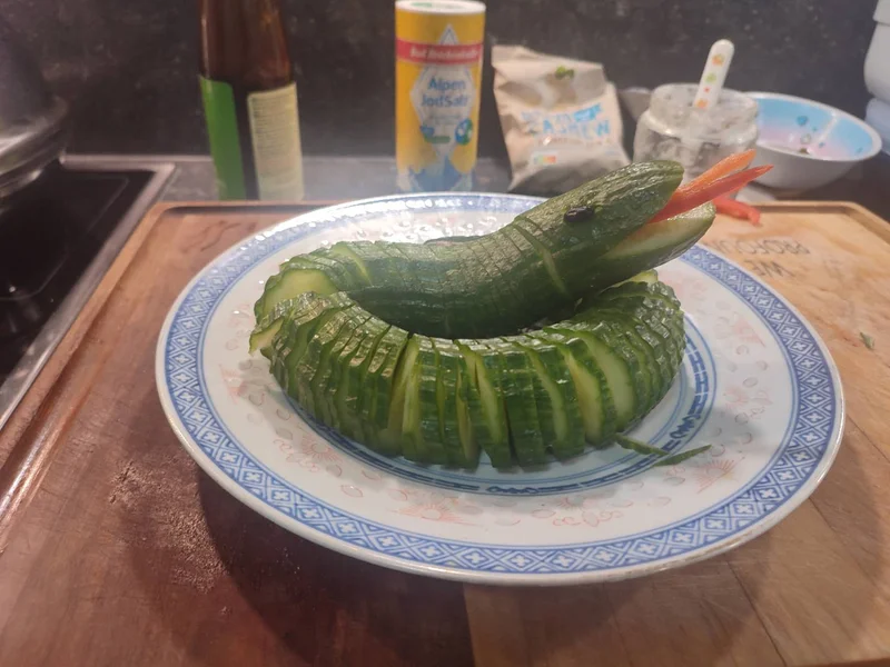 从冰箱里拿出一条黄瓜。绿得很正,还带着点凉气。也没多想,就用上蓑衣刀法。刀一下一下下去,黄瓜没断,却被拉得细长柔软,像是蛇被人慢慢舒开了筋骨。前头切出一刀口,算是蛇口;嵌进一小条红椒,当信子;两粒红豆,往上一按,眼睛就有了。黄瓜一摆,还真像条蛇——不是凶的那种,是挺通人情、有些萌的碧蛇。