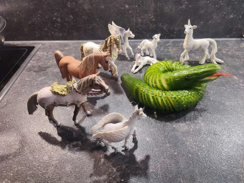 蛇摆好了,我又把家里那些娃娃手办一件一件地请出来。好多马,一匹一匹站好:有黄骠马,四蹄稳当;有白龙马,亮亮的,带着点传奇的样子;有长翅膀的天马,看着就不像凡间的;头上带角的独角兽,也凑了个热闹,介在想象和童话之间。大马、小马驹都有,个头不同,神情各异,摆开来,倒也像个阵势。
