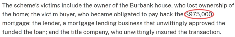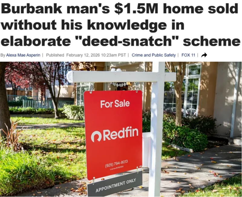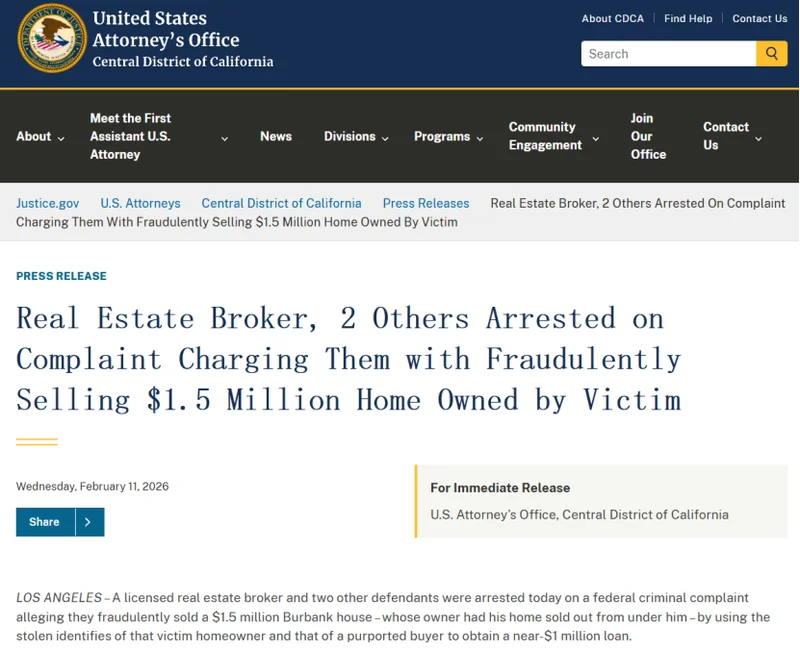 近日,美国联邦当局起诉一名持牌房地产经纪人及其三名同伙,指控他们在2023年底至2024年1月期间,策划并实施了一起“房屋盗卖”骗局,目标是一套位于加州布班克(Burbank)、价值约150万美元的住宅。