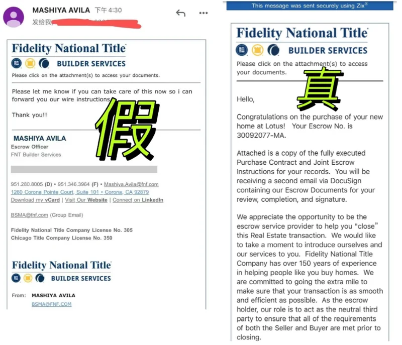 Chloe在购买一套价值约130万美元的房产时,被冒充托管公司(Escrow)的诈骗者骗取了首付款。诈骗者所使用的邮箱地址和公司名称与真实Escrow公司仅有细微差别,让人难以察觉。