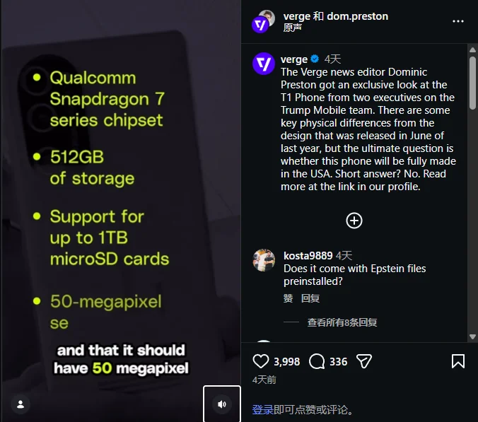 近日,The Verge采访了该手机背后的操盘手,也就是Trump Mobile的两位高管。在这次长达一小时的视频通话中,我们第一次看到了Trump Phone T1的样机,同时还能看到高管在采访里支支吾吾,试图解释为什么发货日期一推再推,从2025年拖到了2026年3月,还要面对配置过时的尴尬。