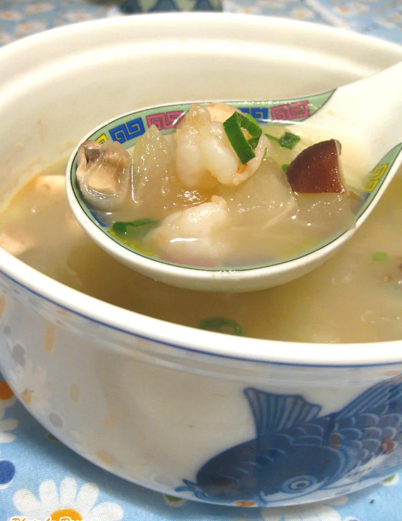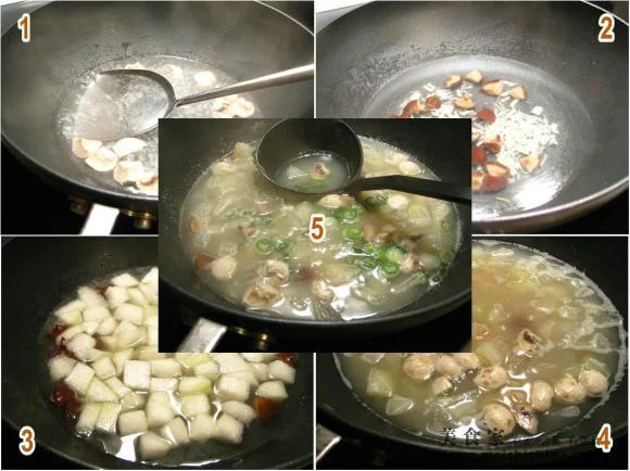 材料:虾6-8只、干瑶柱2粒、冬菇4-6朵、冬瓜粒1碗、蘑菇4-6个、葱若干。