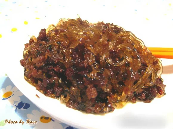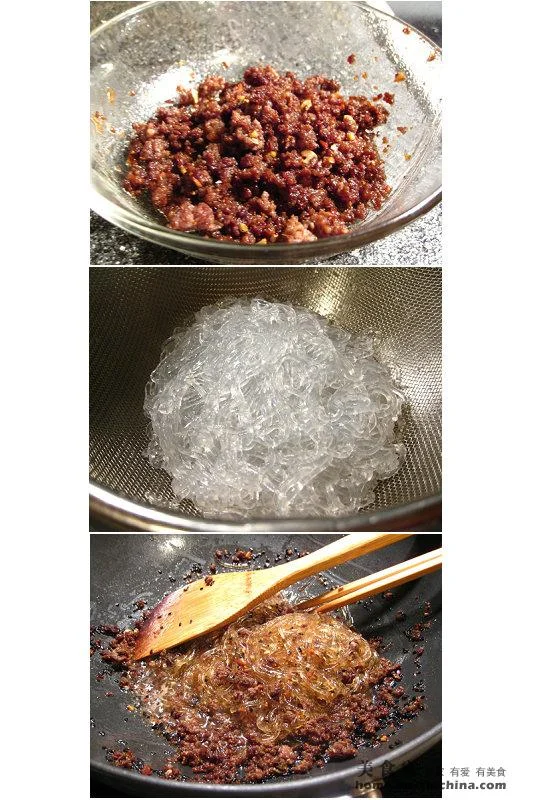 在网上有时看见蚂蚁上树这道菜,放的材料稍有不同,反正,自己冰箱里有什么就放什么呗,说明,大家汪涵下,我做得很不正宗,只是求餐饱饭。本来此菜放小小冬菇粒几好,忘了。