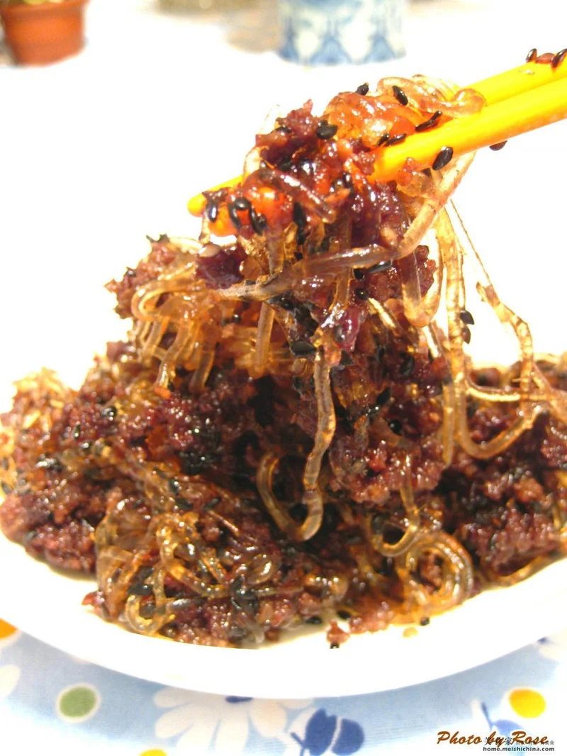 三、准备好蒜茸、葱粒、炒香芝麻,起锅,先炒粉丝,边炒边下生抽老抽和少许糖,再倒入芝麻和炒好的肉末,放1茶匙左右料酒,翻匀即可;