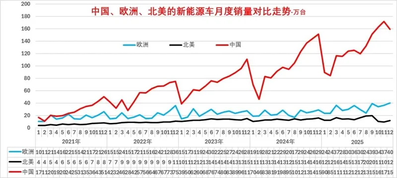 从新能源车的区域市场走势看,2020年欧洲始终是加速上行,超越中国。但2021-2025年中国新能源车市场持续走势强劲,欧洲市场总体不温不火,而北美始终处在低位,增长乏力。