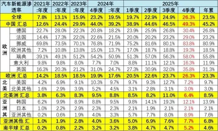 根据乘联会给出的数据,2025年第四季度全球新能源车渗透率达到26.3%。分地区来看,中国新能源渗透率达到49.3%,德国达到30.4%,英国35.8%,而美国仅有7.2%,不均衡性极为明显。