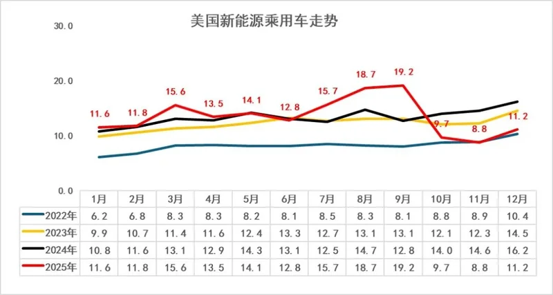 聚焦到美国市场,2025年1-12月美国新能源的销量为163万台,增速仅为1%,处在近几年的较低水平。受高关税、新能源补贴取消引发的涨价因素影响,美国新能源乘用车12月销量仅为11.2万台,同比猛降31%。