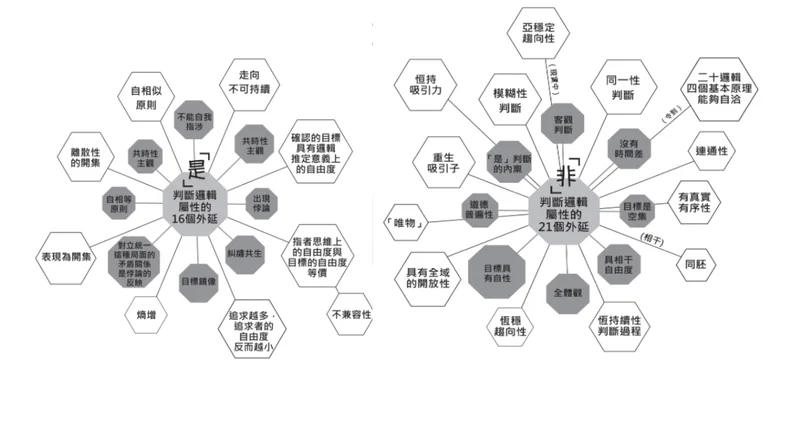 接下来分七个小节,对“是”判断逻辑属性的十六个外延逐层展开讨论。