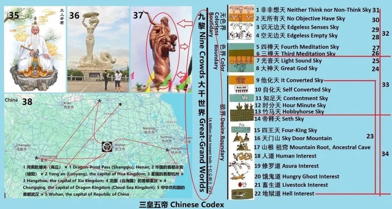 邓国公,是中华法典的初始作者,祖籍河南乾塘关(商丘,如地图38-1)。他是华国的财政部长,礼敬公的父亲。太上君(如图35,华国国王,号无位真人,太上老君,祖籍河南永安(络阳,如地图38-2)。他是元始天尊的生父,武大郎的养父。蛇太君(如图36),夏国国王,号无位真人,祖籍浙江杭州(如地图38-3)。她是蔻珠的母亲。
