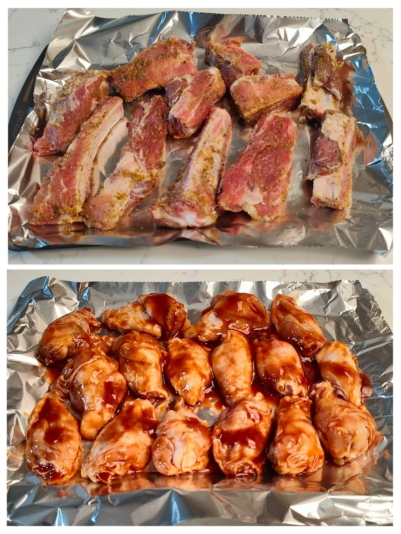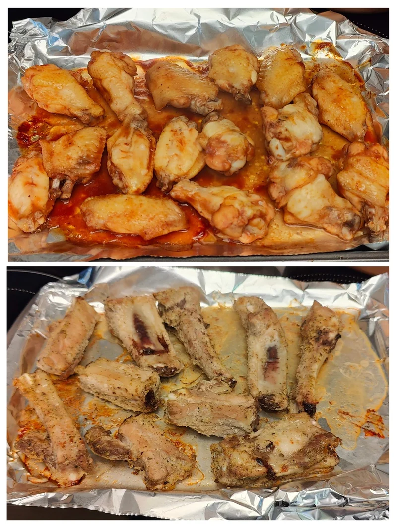烤箱预热到华氏400度,鸡翅和猪排同时入烤箱。20分钟时鸡翅和猪排先后拿出来翻个身,再放入烤箱继续。