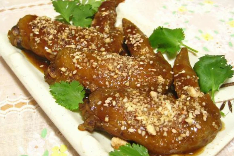 四、用酱油、生粉、味精、水勾芡,淋在鸡翅上,再铺上花生米碎,即成。