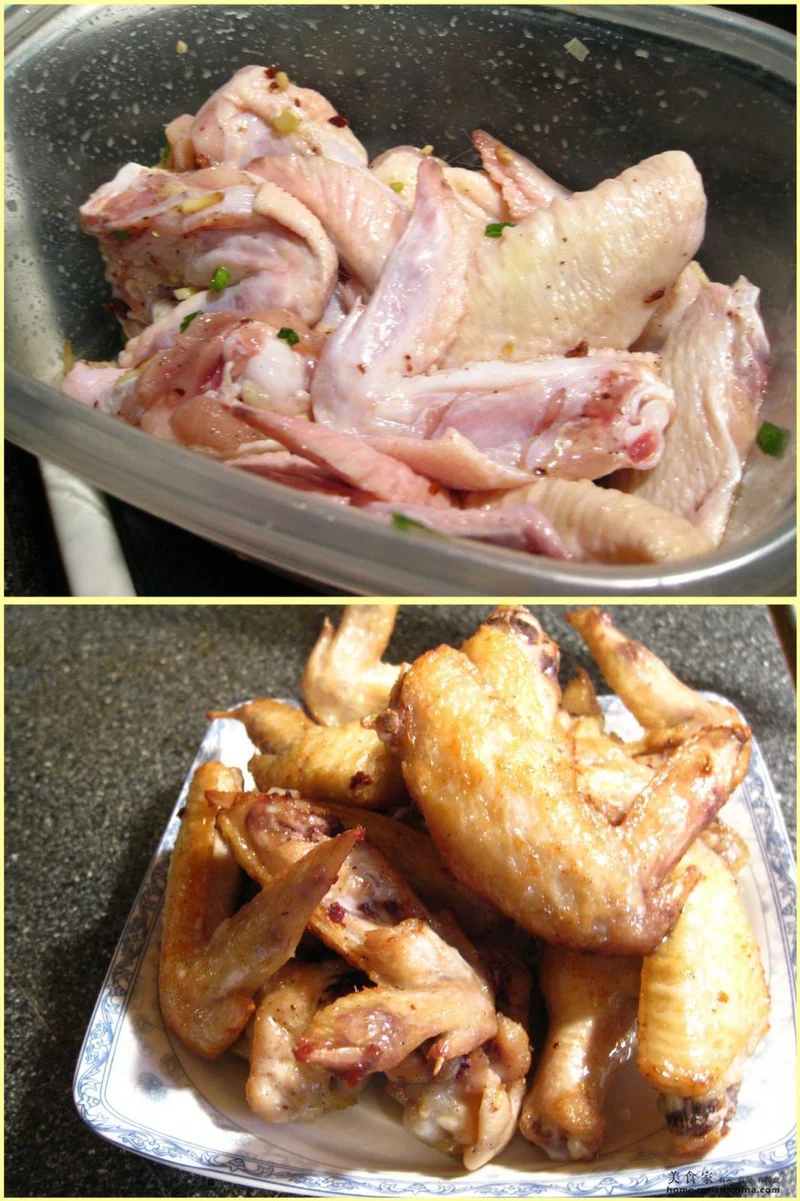 一、把鸡翅根和中翅的背面划两刀。鸡翅用大料、葱姜,料酒,白胡椒面,盐腌制30分钟或以上。