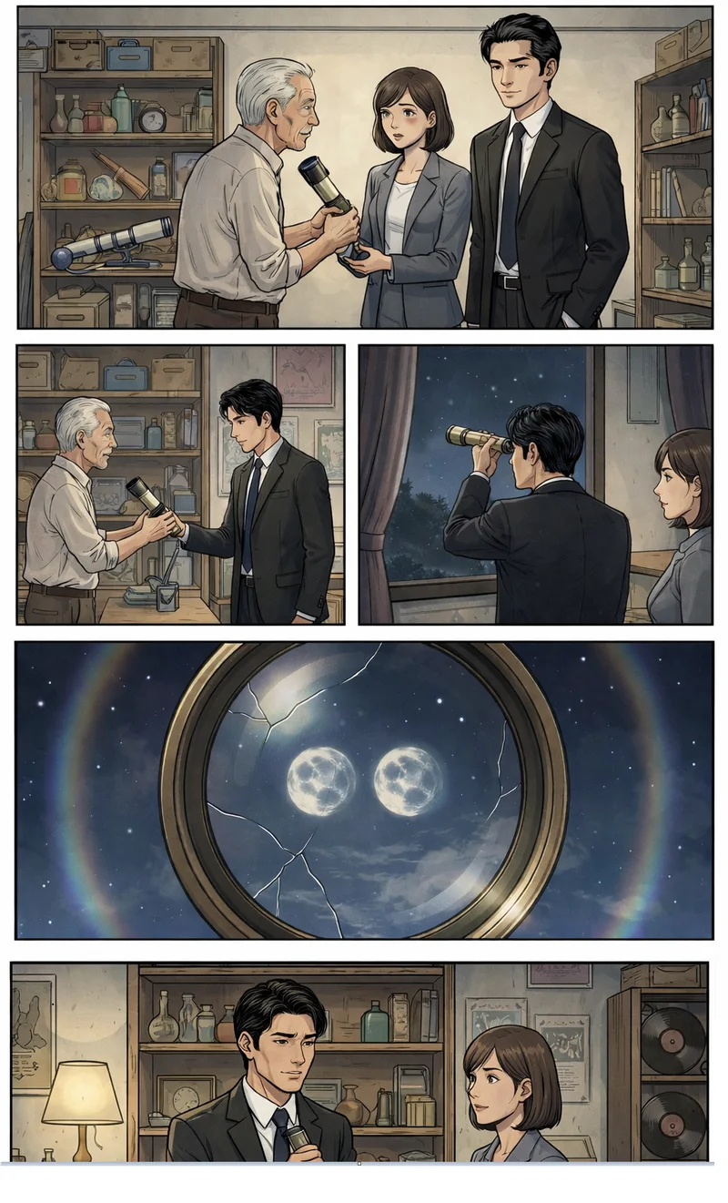 美月正想询问,却见店长已经走到她跟前,手里拿着一支单筒望远镜,得意地说:“这是我最新寻到的器具,叫做‘两个月亮’,想试一试吗?” 松井上前接过了望远镜,将眼睛凑近镜片一侧,不由得微微一愣——在裂成两半的镜片里,他透过重叠的影像与折射的光晕,望见了两个朦胧的月亮。