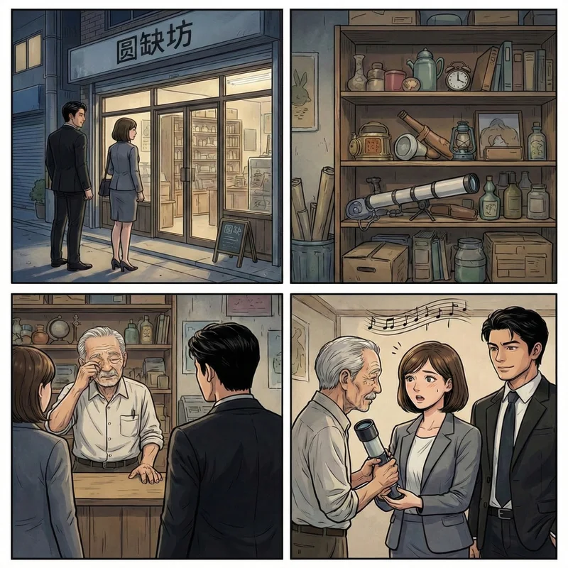 两人匆匆忙忙来到街道唯一亮着灯的店铺前,只见上面写着"圆缺坊"三个字,外面的橱窗放着一些用作餐具的瓷器,有的被金属补上了一块,有的被胶水接合在一起,看起来有种侘寂的残缺美感,店内的物件却又是另一番景象,镜片破损的单筒望远镜,锈迹斑斑的马戏团独轮车,渔港的灯塔缺了一个角,裂缝的青瓷花瓶立在角落,放置的干花指向悬挂的红飞机,破损的双翼在若隐若现的轰鸣声中微颤 —— 那是二楼的老唱片传来的声音。 货架上的各式物件排列在一起,仿佛天方夜谭里的场景,在略显昏暗的灯光中显得更具想象力。