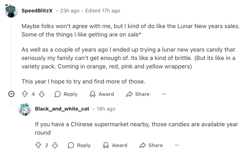 另一位网友则表示,自己其实挺喜欢农历新年的促销:“可能很多人不同意我,但我确实挺喜欢农历新年的折扣。有些我平时爱买的东西会打折。几年前我还因此第一次尝到一种农历新年的糖果,我家人到现在都特别爱吃。”