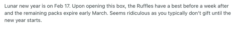 他在帖子中写道:“农历新年是在 2 月 17 日。但我打开这箱之后发现,里面的 Ruffles 薯片,最佳食用期只剩下一周;剩下的几包,也在 3 月初就过期了。