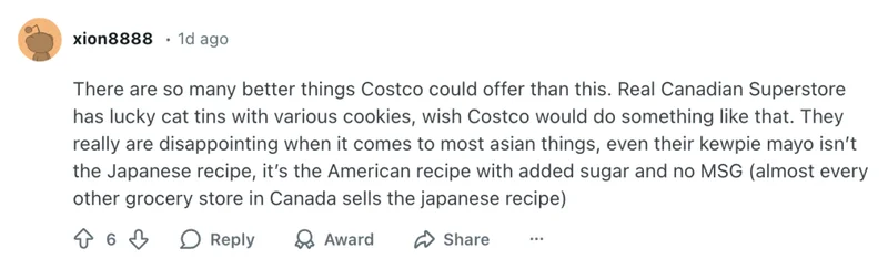 也有人对 Costco 的亚洲商品选择感到失望:“Costco 明明可以做得更好。比如 Real Canadian Superstore 就有装着各种饼干的招财猫铁盒。Costco 在亚洲商品方面一直很让人失望,连丘比蛋黄酱(Kewpie Mayonnaise)卖的都是美版配方,不是日本原版。”