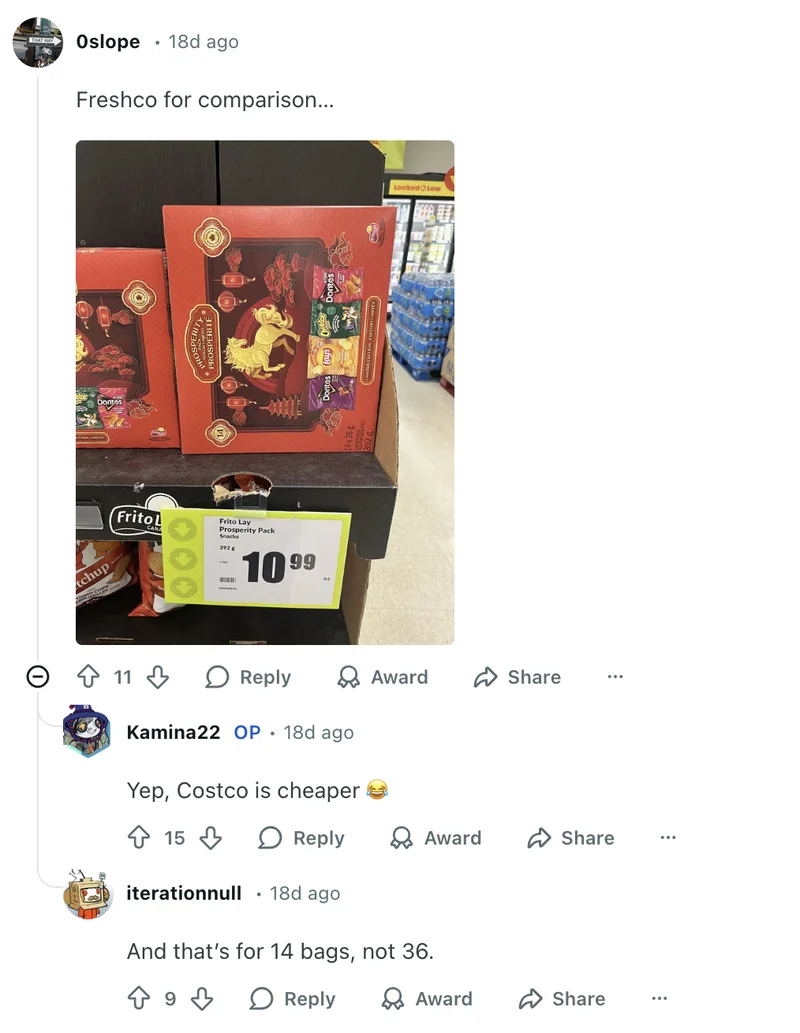 作为对比,有网友指出:“其他超市,14 包的普通薯片就要 11 加元。”