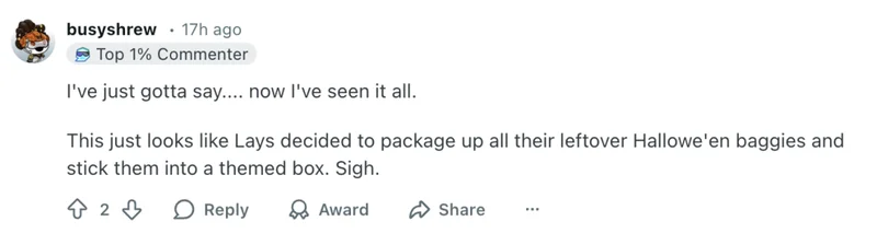 还有人忍不住吐槽包装概念:“现在我算是开眼界了。这简直就像乐事把万圣节剩下的零食小包,全塞进一个春节主题盒子里。”