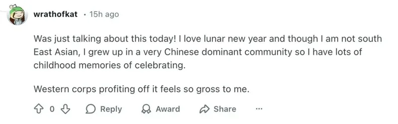 有网友表示:“我很喜欢农历新年。虽然我不是东南亚裔,但我在一个以华人社区为主的环境中长大,有很多关于春节的童年回忆。所以看到西方大公司这样拿春节来赚钱,真的让我觉得很不舒服。”