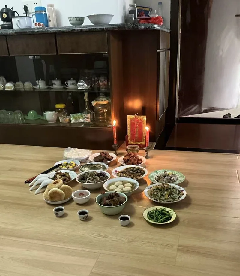 除夕夜,先祭祖,然后拜地主,之后晚间家人吃团圆饭。
