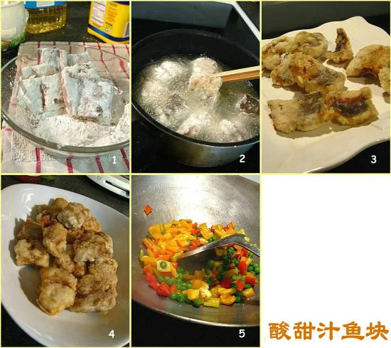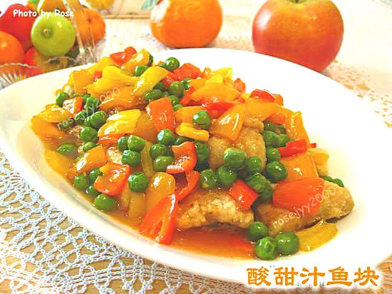 五、将切碎的甜椒和青豆粒在锅内稍兜下,然后倒入用甜酸汁、麻油、一茶匙柠檬汁、少量茄汁(为颜色好看)、少许盐糖、适量白胡椒面、几滴酒、两茶匙左右玉米粉兑成的汁,迅速在锅内搅拌均匀,烧至起泡,代表汁已经滚,均匀地铺在炸好的鱼块上面。调汁时可用舌头试下味,酸了的,加糖,过甜,加少少白醋或柠檬汁。