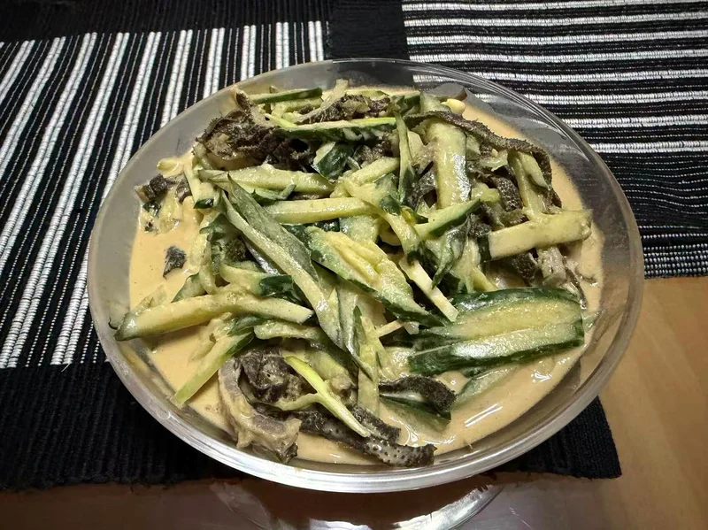 肚丝黄瓜,肚丝过下热水就好,和黄瓜一起加麻酱陈醋盐糖味精拌匀